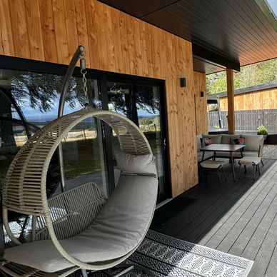 Our architect-designed self-catering lodges blend luxury with nature, featuring expansive decking areas, private gardens, and inviting wood-burning hot tubs for the ultimate in relaxation.