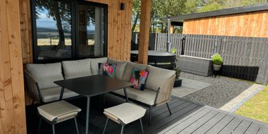 For added comfort, you’ll find a large fire pit table at Wyvis lohge, ideal for cozy evenings, accompanied by high-quality outdoor furniture. Relax further in our stylish hanging chair, perfect for reading a book or unwinding with your favourite music.